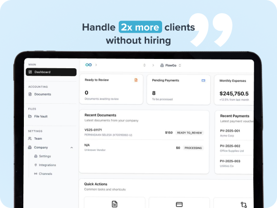 FlowGo automates document collection, reconciliation, and posting so bookkeepers can handle more clients, faster.